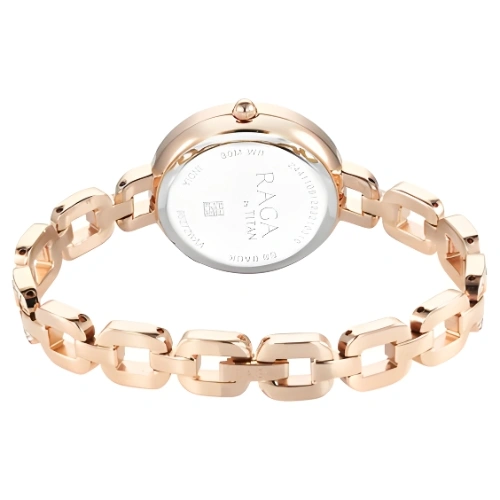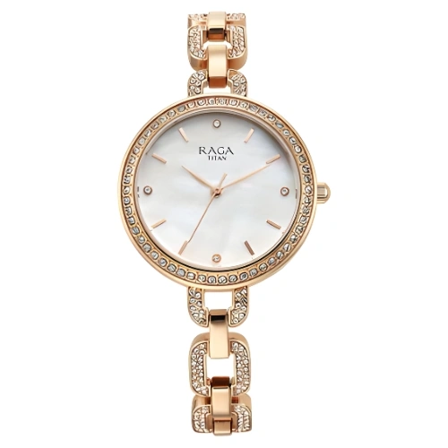 The Titan Raga Showstopper Quartz Alog Mother Of Pearl Dial Metal Strap Watch for Women (95272WM01) combines everyday elegance with reliable performance. Designed under Titan’s trusted Raga Showstopper collection, this watch features a stylish mother of pearl dial paired with a rose gold stainless steel strap, making it suitable for both casual and formal wear.