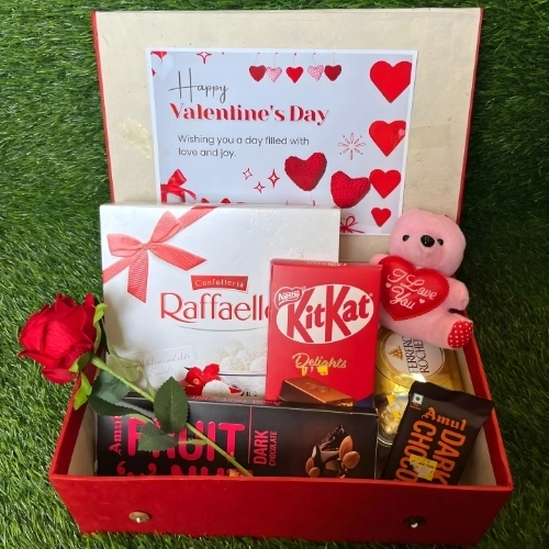Chocolates with a cute teddy and one red rose to express my true love