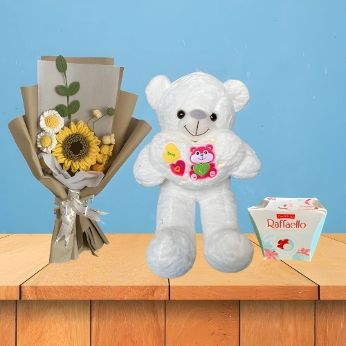 Golden Sunflower Charm with Soft Teddy Bear & Raffaello Treat Box