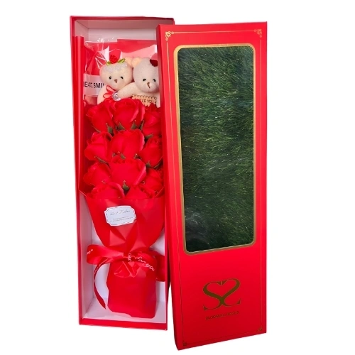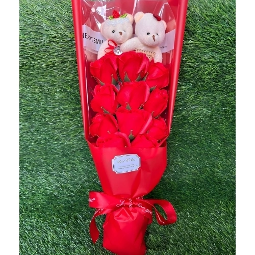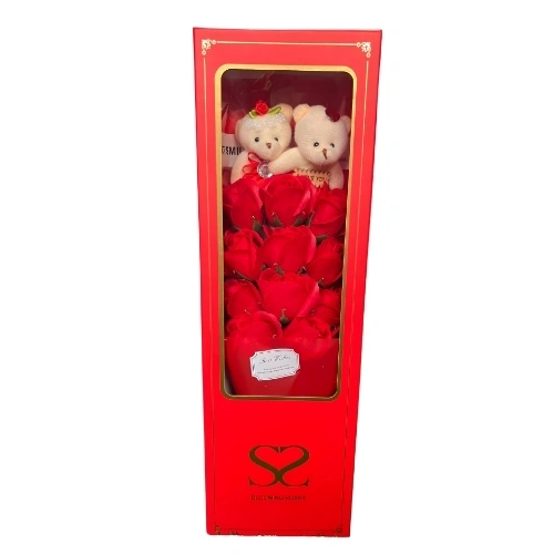 Romantic Red Artificial Flower Bouquet with Two Cute Dolls in Elegant Gift Box-1