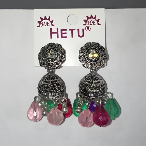 Silver Colour Black Finish With Colourful Dropping Jhumka Earrings